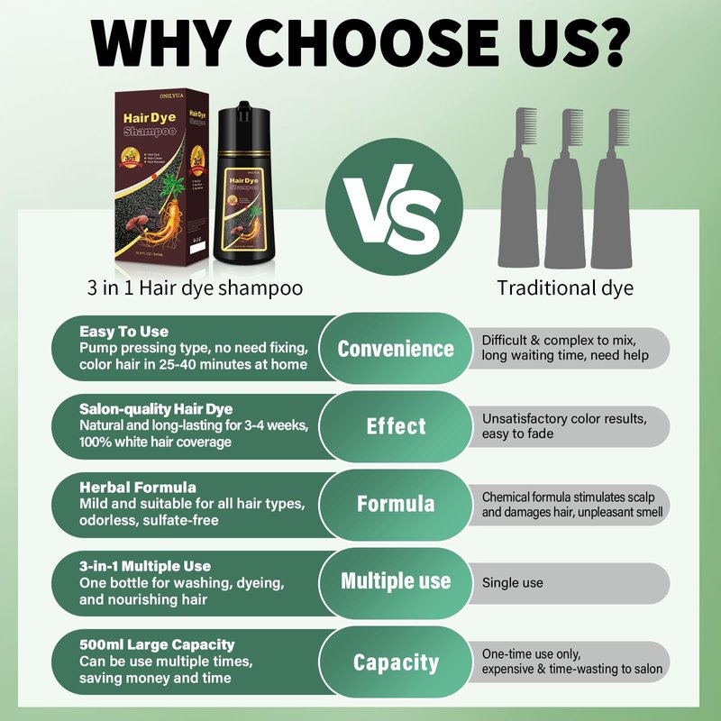 - HAIR DYE SHAMPOO 3 IN 1: Transform your hair in just 25-40 minutes. Used for hair dye, hair shampoo and hair conditioner in one, which is economical and affordable! No longer affected by gray hair and rejuvenate! Please Note: Take a skin test 24 hours before using.