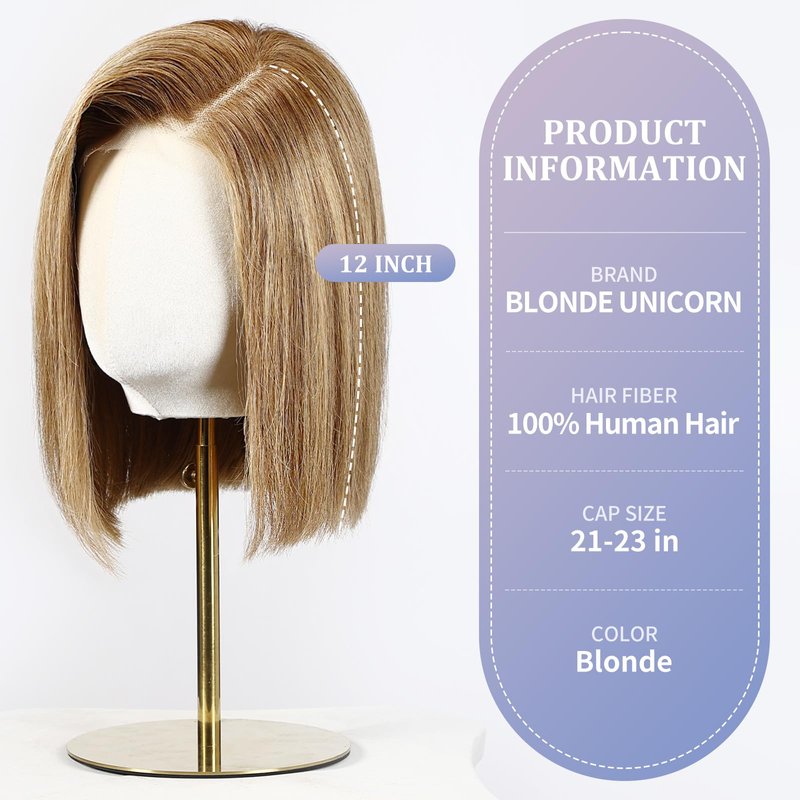 BLONDE UNICORN 12 Inch Bob Wig with Bangs Human Hair,Blonde Brown Bob Wigs for White Women,100% Human Hair Shoulder Length Wigs for Daily Use 180 Density