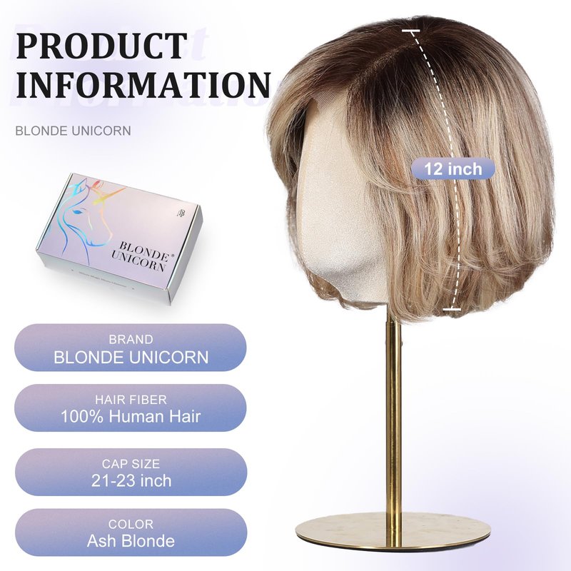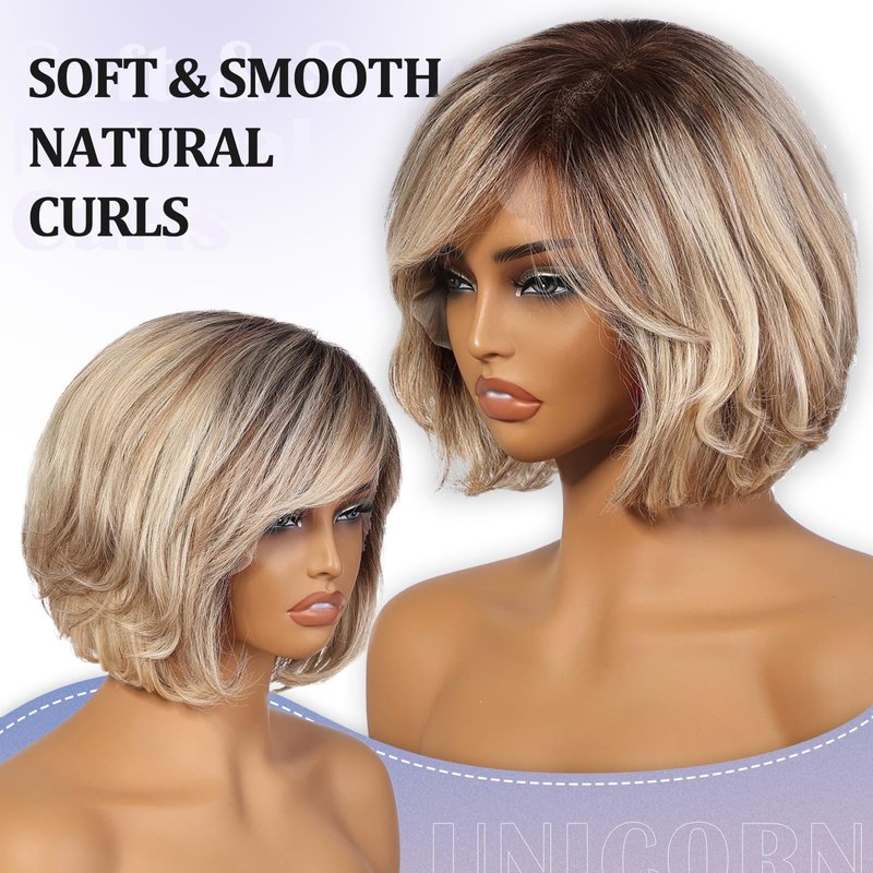 BLONDE UNICORN 12 Inch Human Hair Wigs for Women,Ash Blonde Short Layered Wavy Bob Wig with Bangs,HD Lace Front Wigs