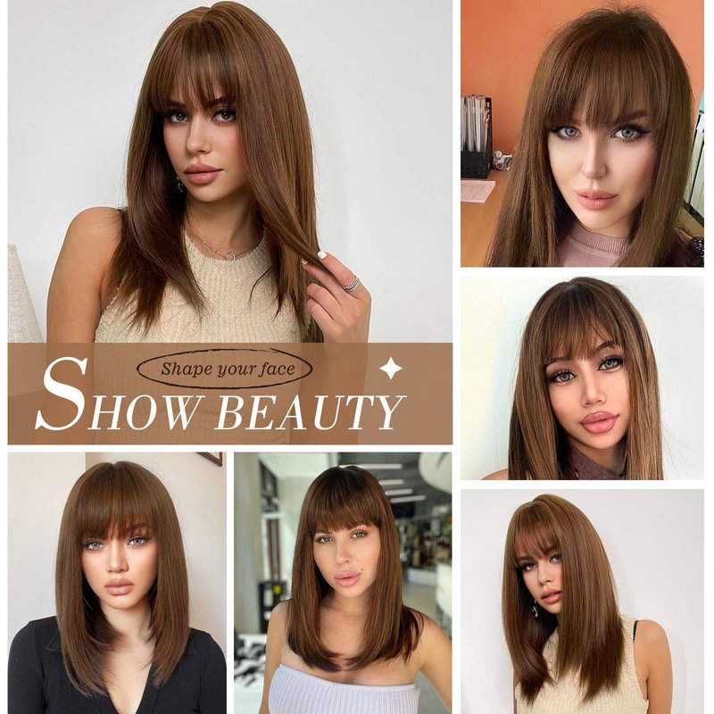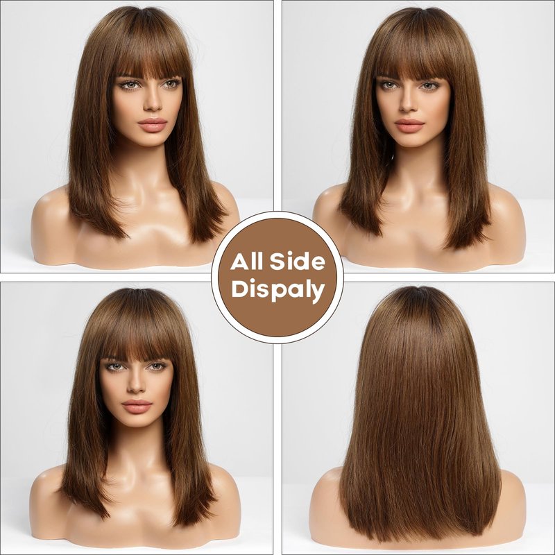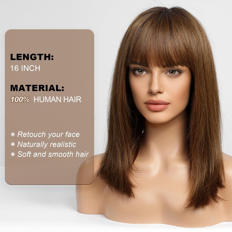 BLONDE UNICORN 16 Inch Bob Wig with Bangs Human Hair,Natural Brown Bob Wigs for White Women,100% Human Hair Shoulder Length Wigs for Daily Use 180 Density