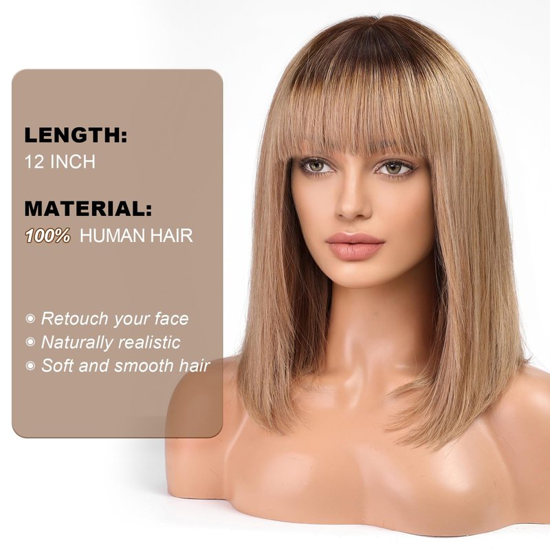 BLONDE UNICORN Ombre Ash Blonde Human Hair Wigs for White Women Straight Wig with Bangs Shoulder Length Human Hair Wigs None Lace Front Wigs 14 Inch