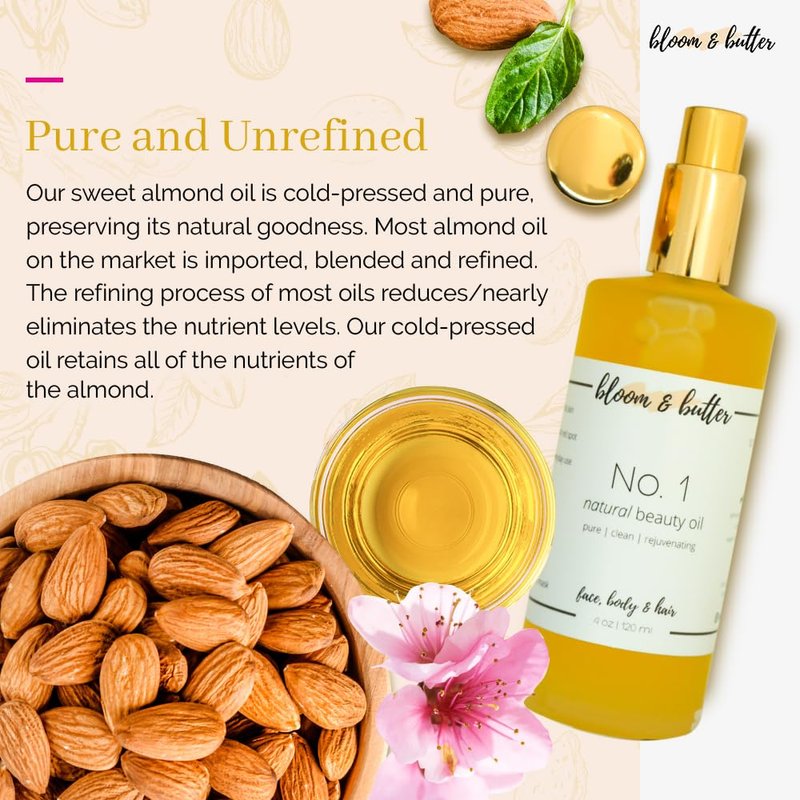 Bloom & Butter Sweet Almond Oil is your go-to beauty oil for luxurious hydration without the greasy feel. Crafted from 100% California-grown almonds, this cold-pressed oil ensures purity and potency, delivering a rich source of Vitamin E essential for promoting skin health. Its lightweight and non-greasy formula absorbs quickly, leaving your skin, hair, and nails moisturized and nourished. Whether you're looking to heal scars, reduce stretch marks, or soothe psoriasis, this versatile sweet oil caters to all your skincare needs. Experience the multi-functional benefits of Bloom & Butter sweet body oil as it becomes a staple in your beauty routine. Use it as a daily moisturizer to keep your skin supple and soft or apply it to your hair for a natural shine and hydration boost. Thanks to its non-comedogenic properties, the suitable sweet almond oil for skin of all types, including sensitive and acne-prone skin, as it won't clog pores. It’s unscented and 100% natural formula ensures a gentle and soothing experience for both adults and babies, making it perfect for treating diaper rashes and other skin irritations. Support sustainability while indulging in premium skincare with sweet almond oil. Sourced from California farms, our almonds are grown and harvested with care, ensuring environmental responsibility and supporting local agriculture. Treat yourself to the pure goodness of this cold-pressed oil while contributing to a greener future. Features: Lightweight and non-greasy formula, Cold-pressed from 100% California-grown almonds, Multi-functional beauty oil for skin, hair, and nails, 100% natural and unscented, Sustainable sourcing supporting local agriculture. Features: