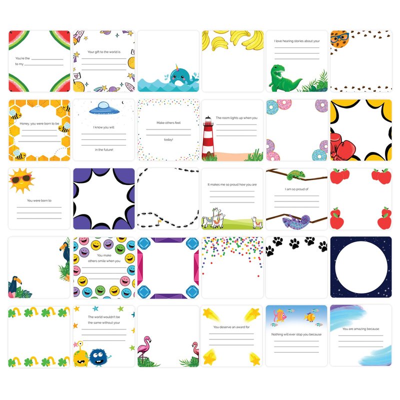 - [Durable & Glossy Finish]: Each 3"x3" card features a glossy finish with vibrant illustrations and hand-lettered notes that stand out, making them perfect lunch box accessories for kids.