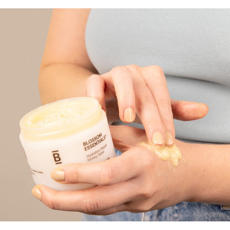 Upgrade your self-care routine with Blossom Essentials Hydration Repair Honey Salve. With our miracle butter, you can help prevent future irritation and itching through continued treatment. Our all-in-one formula provides a barrier as it protects against pollutants entering and moisture exiting. The 4-ounce container measures 2" W x 2" H and is chemical and cruelty-free. This waterless oil-based salve offers relief so that you can go about your day pain-free. Our mission is to create a soothing moisturizer for men and women free of all the harmful stuff. Instead, our new and improved concoction includes coconut and sweet almond oil, calendula extract, beeswax, and more. This product does contain nuts, and we recommend consulting your physician for any allergies and avoid using our balm for children under one year. The honey salve does not need to be refrigerated and is suitable for up to 24 months when stored in a dry, cool place. Our products are proudly made in the USA.