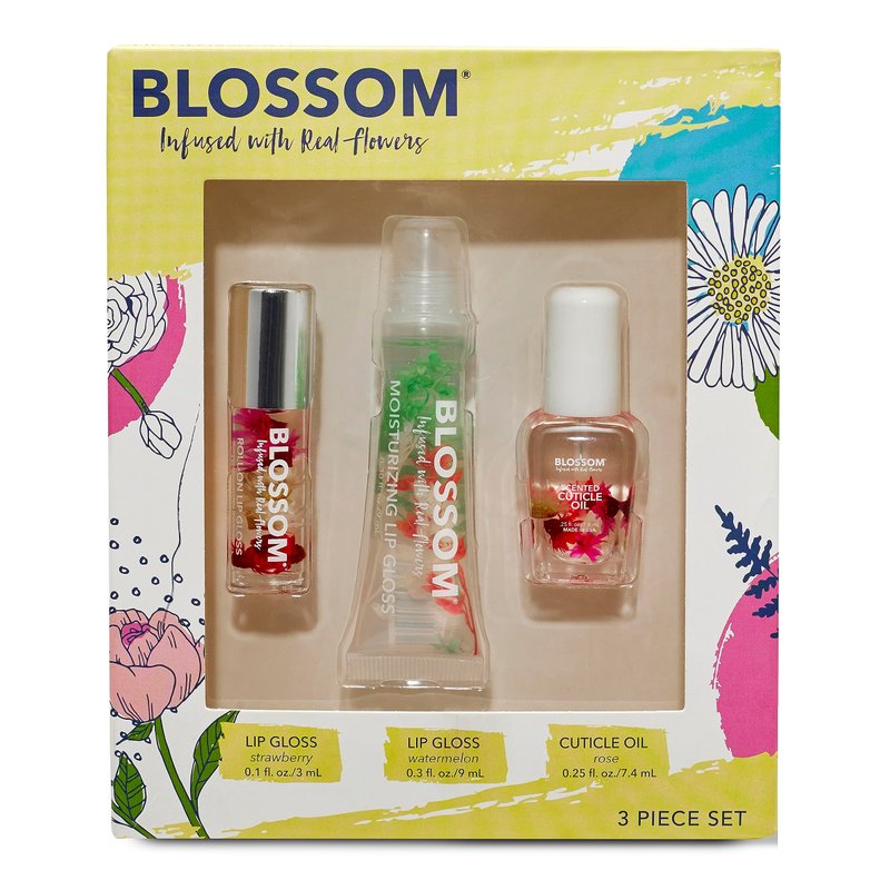 - PERFECT HOLIDAY GIFT: Each set comes with 1 Full Size Lip Tube (watermelon), 1 Mini Roll On Lip Gloss (Strawberry), and 1 Mini Scented Cuticle Oil (Rose) and makes a great stocking stuff add on gift for Christmas, Easter, Birthday, holiday and more. Be sure to check out the rest of the Blossom line for coordinating body and makeup products