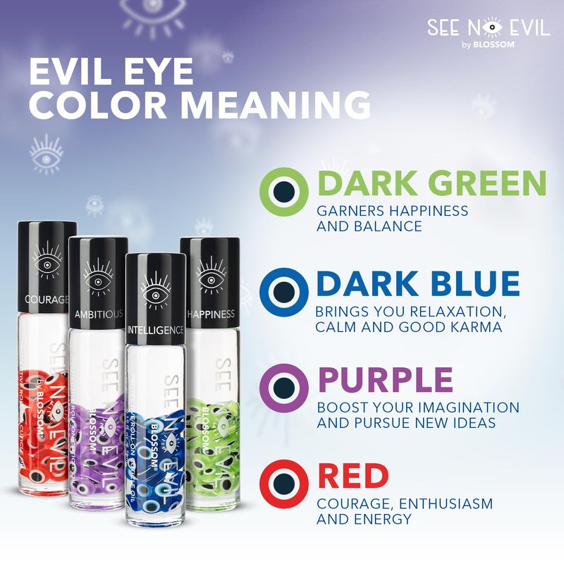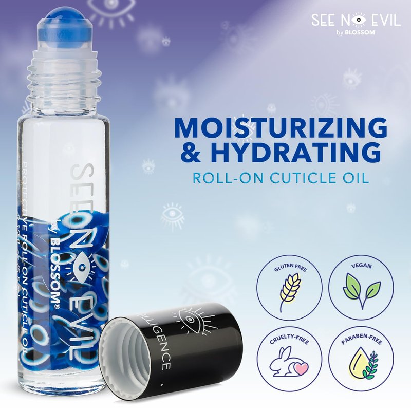 - ROLL-ON CUTICLE OIL: Blossom’s See No Evil Roll On Cuticle Oil is available in 4 positivity-inspired scents (Courage Rose, Intelligence Jasmine, Happiness Lily, and Ambitious Lavender) with matching colored evil eye charms