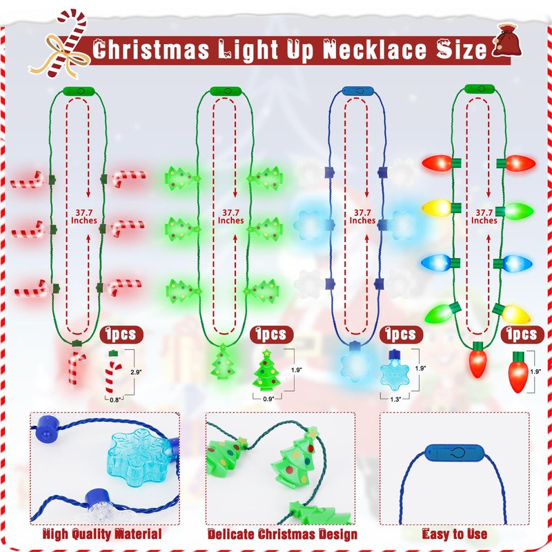 - Festive Christmas Designs: The Blowata Christmas LED party pack includes 4 Christmas headbands featuring classic holiday symbols like reindeer antlers, Christmas trees, and elf hats. Each pack also comes with 4 Christmas light necklaces and 4 pairs of glasses in assorted festive designs, such as candy canes, snowflakes, and Santa motifs.