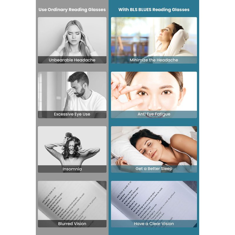 - Blue Light Filter Reading Glasses: Bluelight lens provide all day protection against 100% blue ray radiation and UV400, a must for digital screen time on computer gaming, laptop, video games, phone or TV; Time to say good bye to your eye fatigue, eyestrain, dry eye and headache