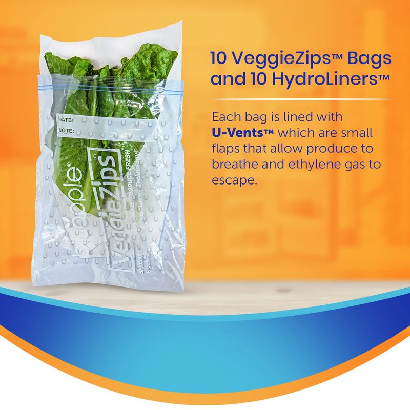 - THROW AWAY LESS PRODUCE: These vegetable and fruit saver bags have special U-Vent flaps that allow fresh air in and ethylene gas to escape. Each fresh food bag comes with a HydroLiner, a soft, cloth-like towel that adds moisture to produce when used wet and, if used dry, absorbs excess moisture. Different types of produce need different levels of humidity and now that is possible with VeggieZips! They help to maintain humidity inside the bag to keep produce fresh longer!