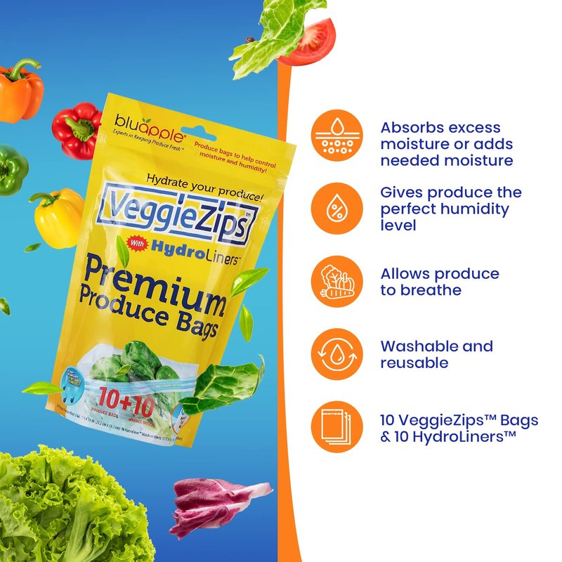 BluApple VeggieZips Premium Produce Storage Bags - 10 Produce Food Saver Bags + 10 HydroLiners to Keep Produce Fresh Longer - Washable & Reusable Bags for Humidity Control for Fruits and Vegetables