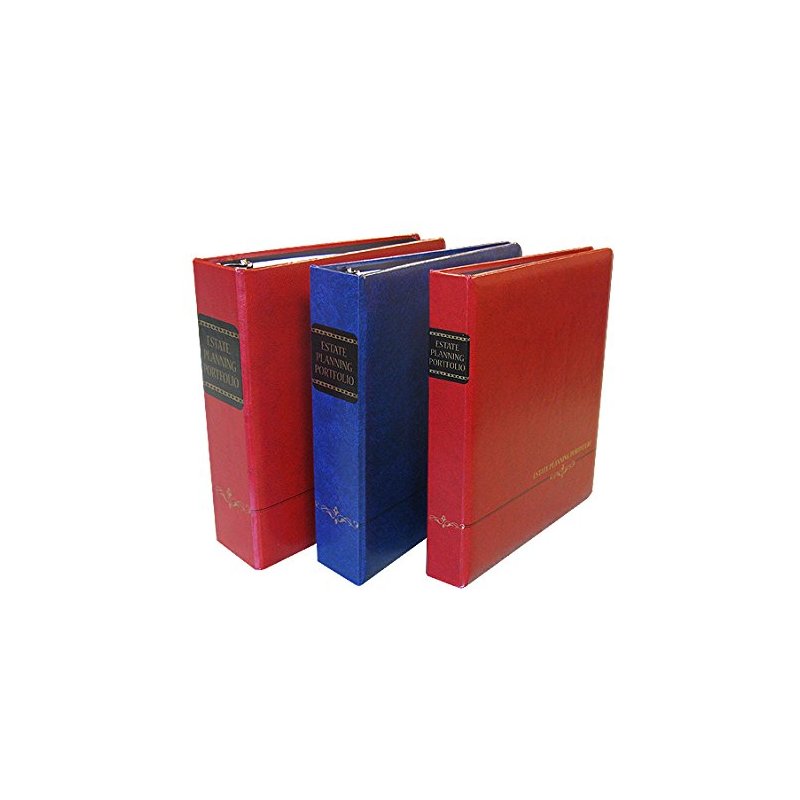 Our new padded Estate Planning Portfolios have 3 "slant D" rings. The inside cover has our exclusive pocket to hold additional papers, a CD and 2 Business Cards. These portfolios offer a secure, professional way to organize and protect important Estate information. A great gift for new homeowners! Binders are available in Blue or Red and in 3 different ring options: 1", 1.5", and 2". Each binder comes with a set of 18 position tabs including: *PERSONAL & FAMILY HISTORY, *DURABLE POWER OF ATTORNEY, *ADVANCED HEALTH CARE DIRECTIVES/PROXIES, *FINANCIAL-ASSETS, *BANK STATEMENTS, *BROKERAGE ACCOUNT STATEMENTS, *WILLS, *TRUSTS, *DEEDS, *TAX RETURNS, *GIFT TAX TRANSFERS, *PERSONAL PROPERTY, *TRANSFERS, *FUNERAL ARRANGEMENTS, *IMPORTANT DOCUMENTS LOCATOR, *MISCELLANEOUS, *FINANCIAL-LIABILITIES, *INSURANCE, *CORPORATE/PARTNERSHIP AGREEMENTS. Personal information sheets included are: * PERSONAL AND FAMILY HISTORY & INFORMATION, * ASSETS LISTING, * LIABILITY LISTING, * FUNERAL ARRANGEMENTS, * IMPORTANT DOCUMENTS LOCATOR. Capacity: 1" - Holds up to 200 sheets of 20lb Paper.(Spine Measures 2"), 1.5" - Holds up to 300 sheets of 20lb Paper.(Spine Measures 2.5"), 2.5" - Holds up to 500 sheets of 20lb Paper.(Spine Measures 3.5")