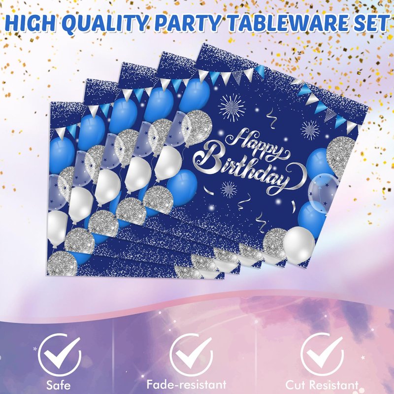 Material: the happy birthday plates and napkins sets is made of Paper, Navy Blue Silver tablecloth are made of quality PE plastic.
