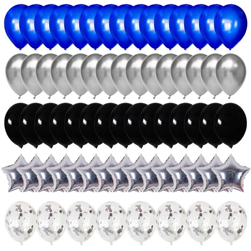 - Blue Black and Silver Balloon Kit :You will get 62 pcs black silver blue balloons, including 15 Royal blues ,15pieces black balloons,15 pieces silver balloons ,5pieces confetti silver balloons 10 pieces metallic five star balloons 2pc balloon strip tape,You willget a unique and fashion party!
