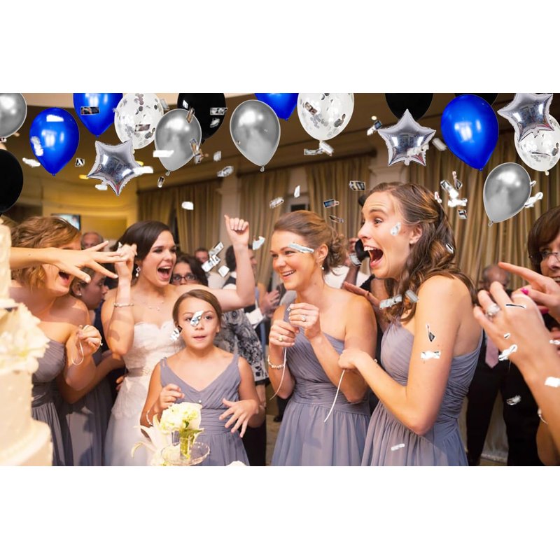 - Easy to Use - Our royal blue black silver balloons easily blow up the balloon,no experience required.The Balloons can add atmosphere to your party.the confetti balloons stick to one side which can make your party more beautiful.