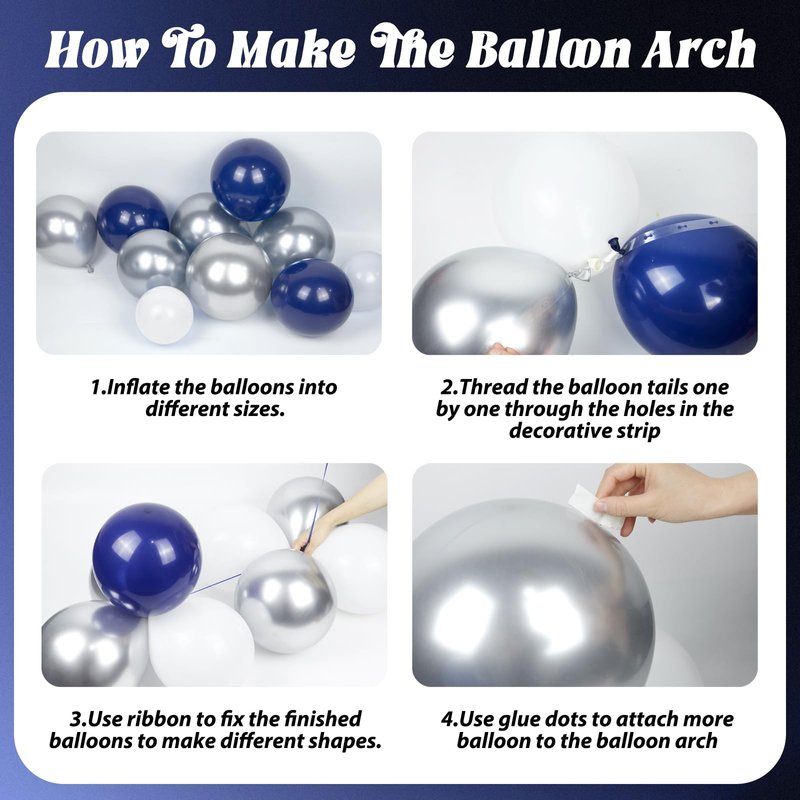- Great Quality: Our blue and silver birthday decorations for men are high quality. The blue, silver, and white latex balloons are great quality and less likely to burst. We include three tools for easy balloon garland arch creation: ribbon, glue dots, decorating strip. For foil balloons, use a hand pump to inflate through the opening, and deflate with a straw for reuse