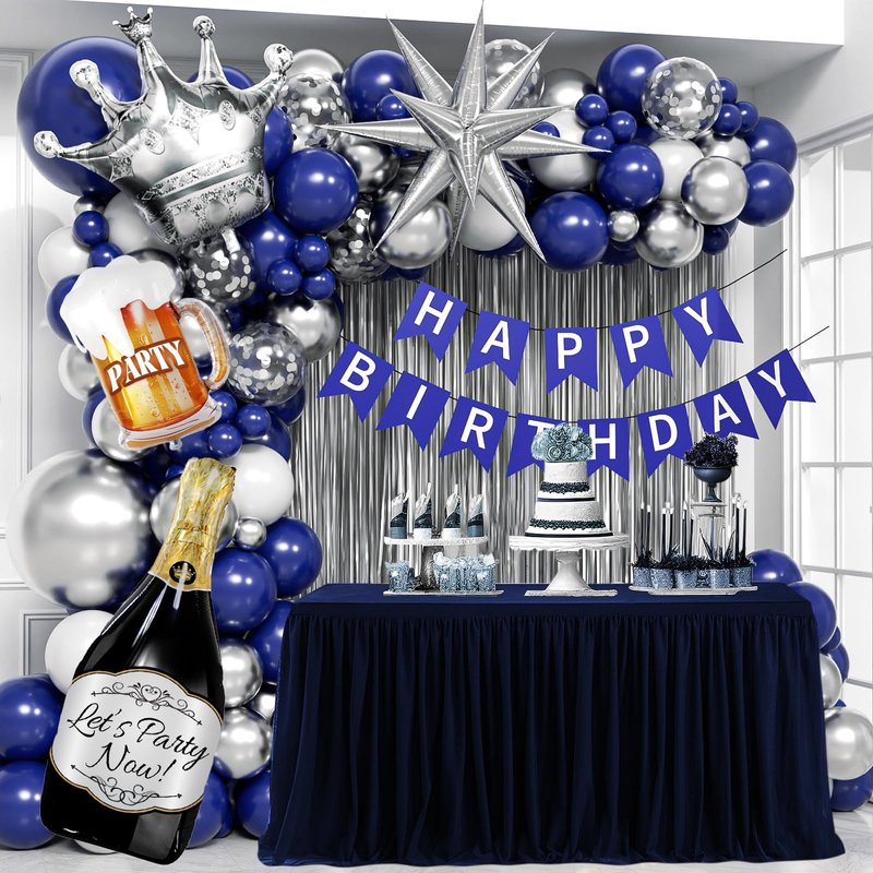 - Package Include: The blue happy birthday decorations kit included 36pcs navy blue balloons(18inchx1, 10inchx15, 5inchx20), 36pcs metallic silver balloons(18inchx1, 10inchx15, 5inchx20), 10inch white balloonsx20, 12inch silver confetti balloonsx6, foil balloonsx4, happy birthday bannerx1, silver fringe curtainsx2, glue dotsx100, decorative stripx1, blue ribbonx1