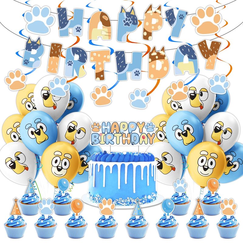 Blue Dog Birthday Party Supplies , Blue Dog Party Decorations - big Cake Topper - 12 Cupcake Toppers - 18 Balloons -6 swirl- Banner