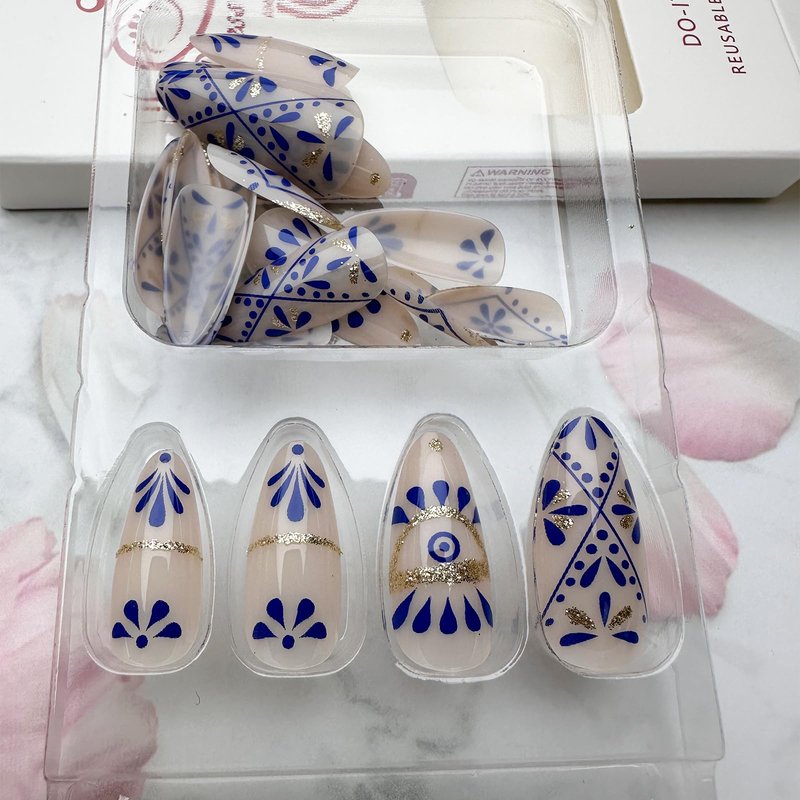 - Package Contains:You will get 24Pcs blue eyes fake nails with design press on nails in 12 sizes, 1 nail file and 24 jelly glues,1 small wooden stick.
