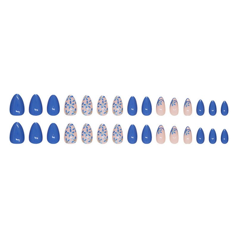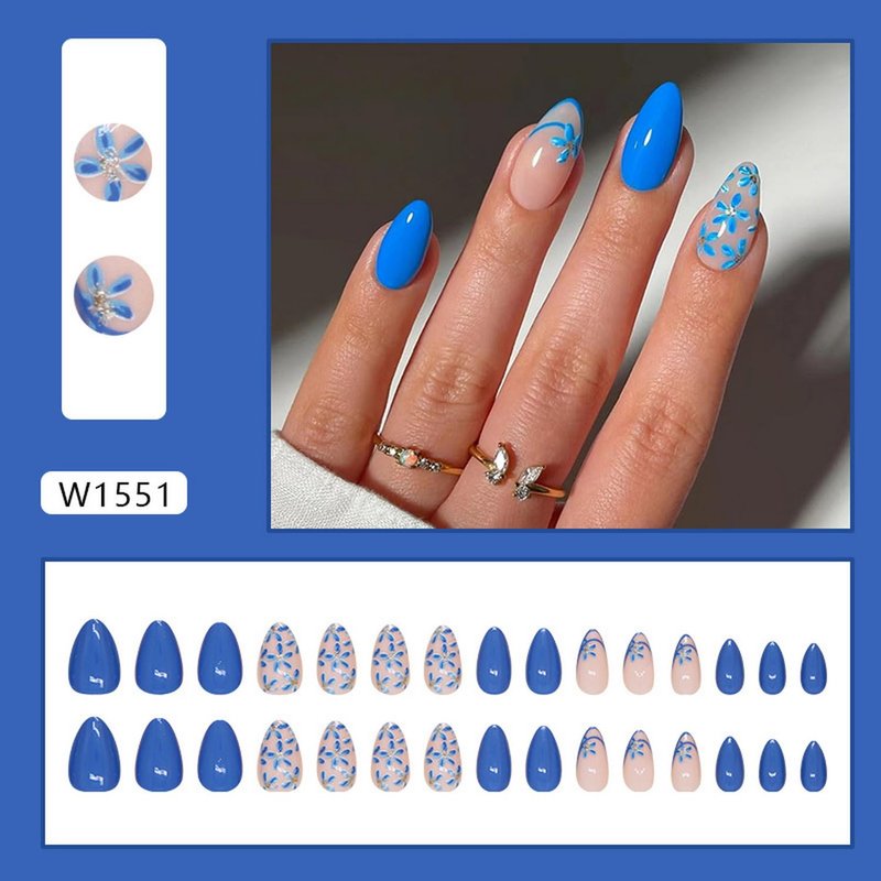 Blue flowers press on nails medium almond fake nails french tip full cover glue on nails blue pink glossy designs.They made of high-quality glossy acrylic,it provides a durable and long-lasting choice for women daily nail decoration.These easy to apply nails can enhance your usual look,aiming to effortlessly and elegantly enhance your style.