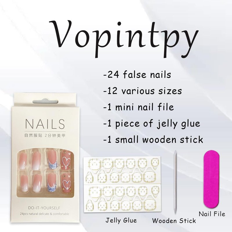 - 【Package & DIY Nails】You'll get 24 false nails in 12 sizes. 1 mini nail file, 1 small wooden stick, 1 piece of adhesive tab glue. You can safely choose a fake nail that fits your finger size and DIY your desired nail shape.