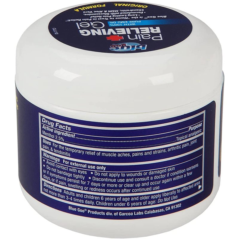 Blue goo pain relieving gel, trusted by customers for over 15 years. Provides fast-acting relief for all types of pains including muscle strains and sprains, stiff joints, backaches, neck aches, and headaches. Made with 100% PURE EMU oil that acts as a natural moisturizer and pain reliever utilized for its anti-inflammatory properties. For best results, use blue goo after sports activities to cool down muscles. And now for your convenience, the new squeezable bottle features our easy-to-use dispenser for mess-free application. Blue Goo combines powerful ingredients and technology to combat pain, boost performance and alleviate foot care ailments fast and effectively. Features & Benefits: Provides long-lasting pain relief Use after activity or while resting to help cool muscles Fast-acting, cooling & soothing relief Non-sticky, easily absorbed by the skin Provides relief from stiff joints, backaches, headaches, neck aches, muscle sprains Directions: Adults and children 6 years of age and older apply liberally to the affected areas not more than 3-4 times daily. Children under 6 years of age: Do Not Use. Important Information: Warnings: Avoid contact with eyes. Do not apply to wounds or damaged skin. Do not bandage tightly. Do not use heating pads or heating devices. Discontinue use and consult a doctor if the condition worsens or if symptoms persist for 7 days or more or clear up and occur again within a few days, or if pain, swelling, or redness occurs after continued use. Keep out of reach of children: If swallowed, get medical help or contact a poison control center right away. Other Information: Store at room temperature, 59 to 77F (15 to 25C).