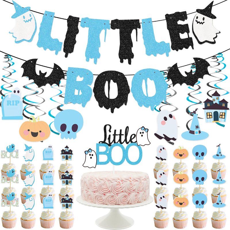 - 【What You Will Get】: 1 pcs blue and black little boo day Banner, 6 pcs blue halloween baby shower party hanging swirl 1pcs blue little boo cake topper 24pcs blue baby shower cupcake topper. The halloween birthday party decorations provide everything you need to decorate your birthday party!