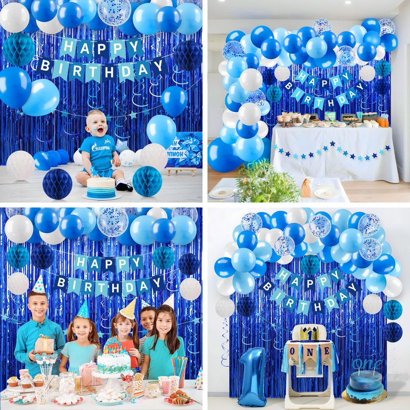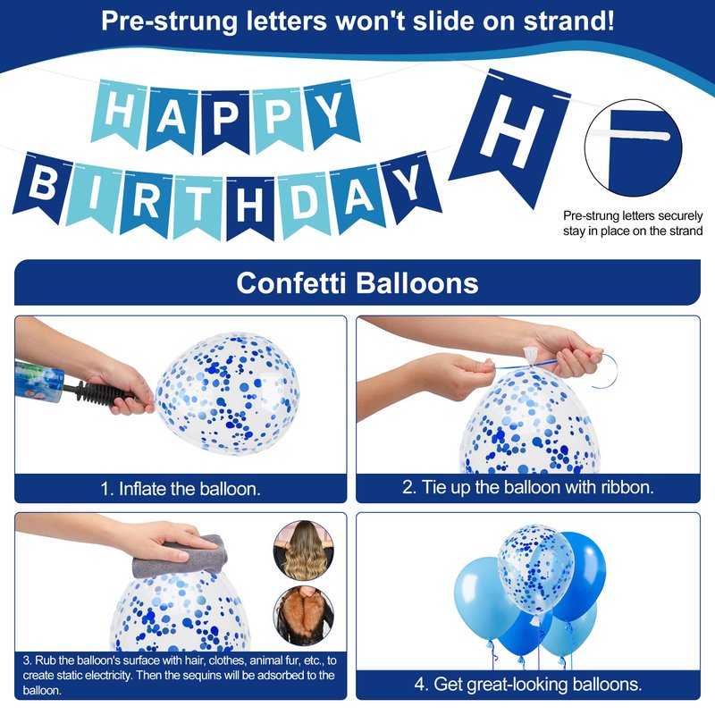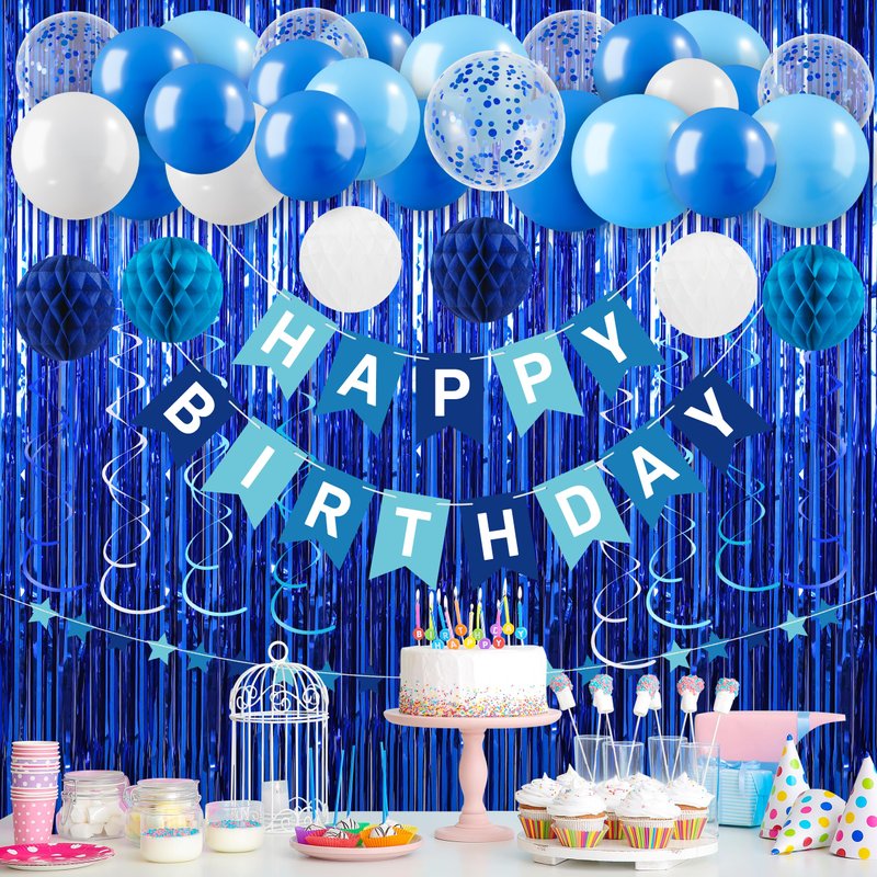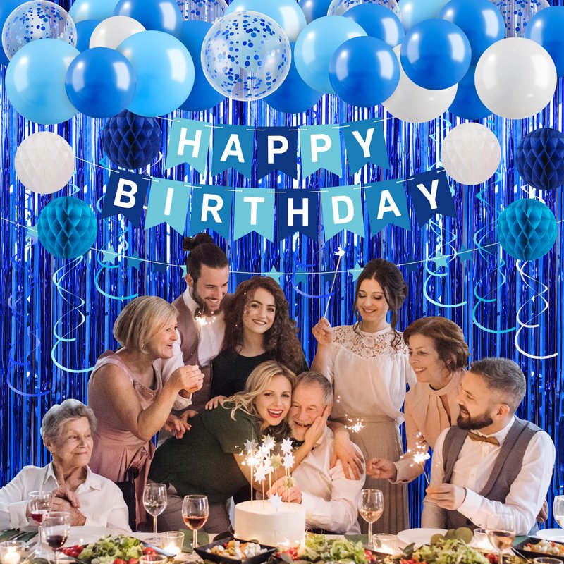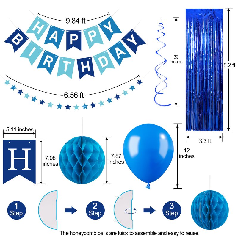 - The Blue Happy Birthday Banner Decorations Kit: The package includes 1 blue happy birthday banner, 2 blue foil fringe curtain backdrop, 1 star garland, 10 dark blue balloons, 10 blue balloons, 5 blue confetti balloons, 5 white balloons, 8 hanging ceiling decorations, 6 tissue paper pom poms, 100 double-sided glue dots, and 2 balloon ribbons. Our party decoration package can add a gorgeous atmosphere and create the perfect party ambiance, making it ideal for men's or boys' birthday celebrations!