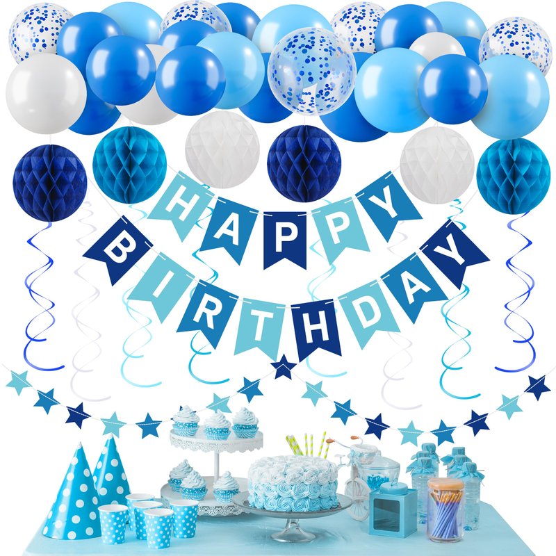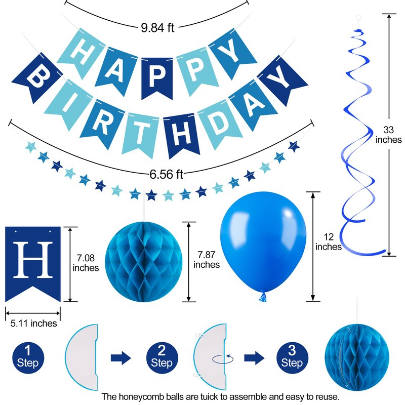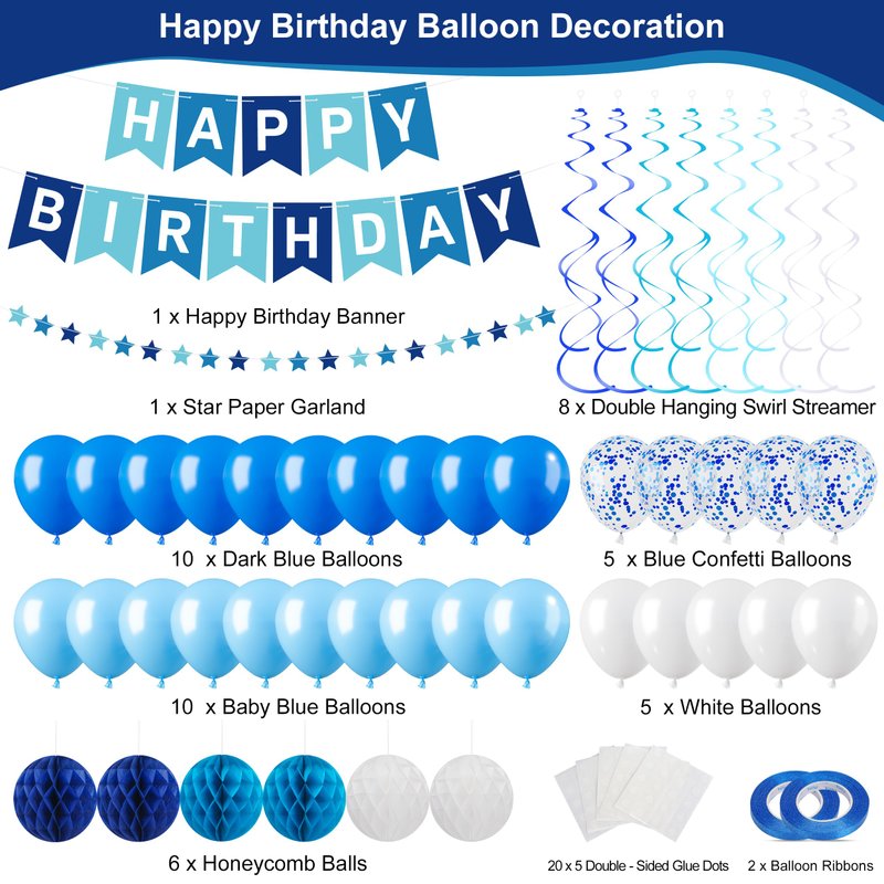 - The Blue Happy Birthday Banner Decorations Kit: The package includes 1 blue happy birthday banner, 1 star garland, 10 dark blue balloons, 10 baby blue balloons, 5 blue confetti balloons, 5 white balloons, 8 hanging ceiling decorations, 6 tissue paper pom poms, 100 double-sided glue dots, and 2 balloon ribbons. Our party decoration package can add a gorgeous atmosphere and create the perfect party ambiance, making it ideal for men's or boys' birthday celebrations!