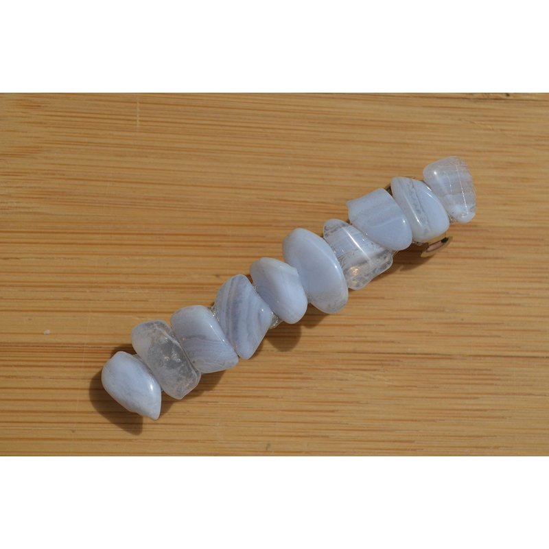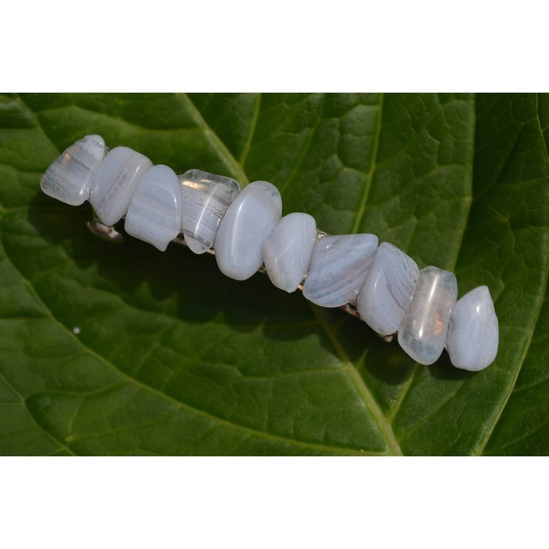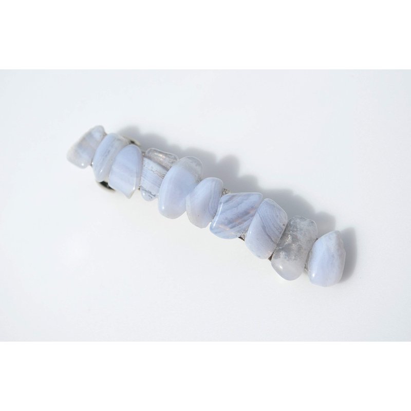 Pretty blue lace agate stones french barrette, the stones have a gorgeous spotted coloring. The stone french barrettes adorned with small blue lace agate stones. The blue lace agate stones hair clip is the perfect accessory for a night out, and can dress up an outfit or be used for a special event, like a quinceanera, first communion, or even a wedding. The hair clip is hand made in the USA and come from a smoke free environment The blue lace agate stone hair clip measure: 61 mm x 16 mm x 15 mm or 2.4 inches x .6 inches x .57 inches.