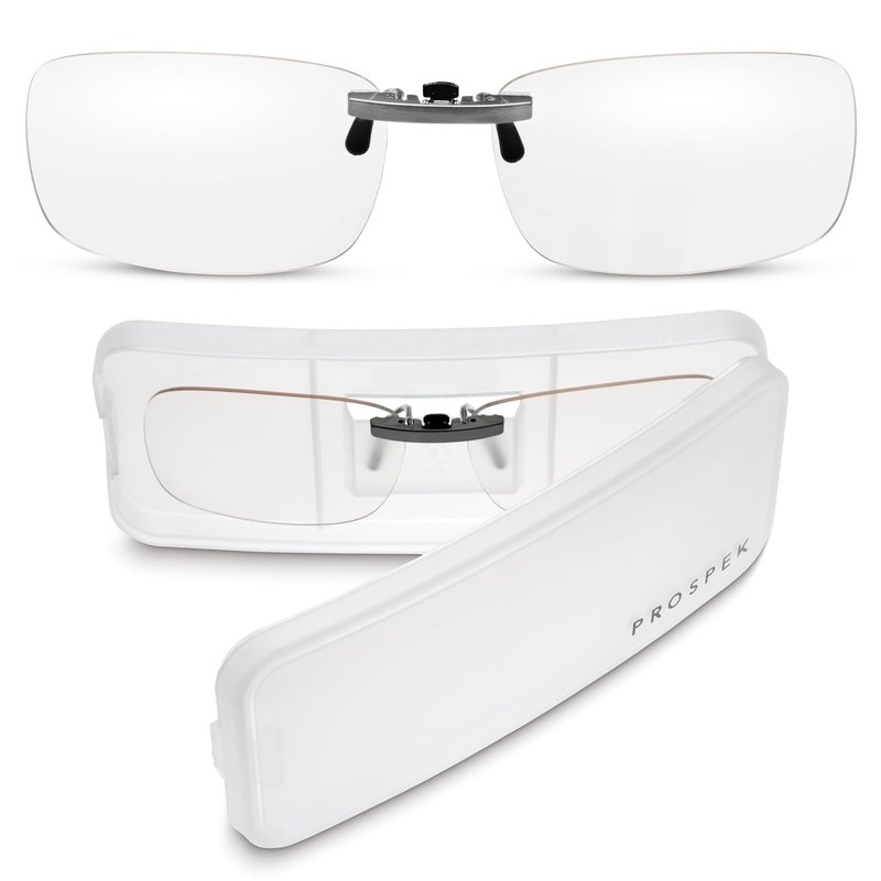 Introducing the PROSPEK Advanced Blue Light Blocking Clip-On with Clear Lenses. Designed for wearing over prescription glasses, it blocks 50% of all blue light and 90% of high-energy blue light. Enjoy crystal-clear vision and protect your eyes from digital eye strain. Portable and sleek, it's perfect for professionals, students, and gamers. Prioritize your eye health with PROSPEK Advanced Blue Light Blocking Clip-On.