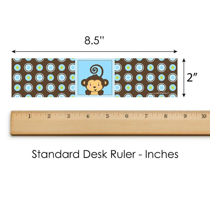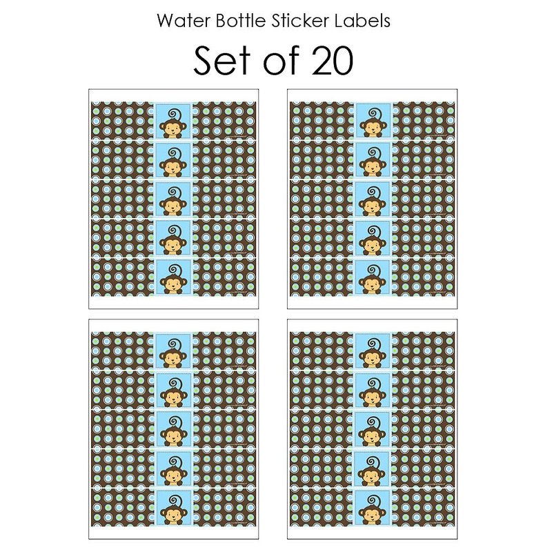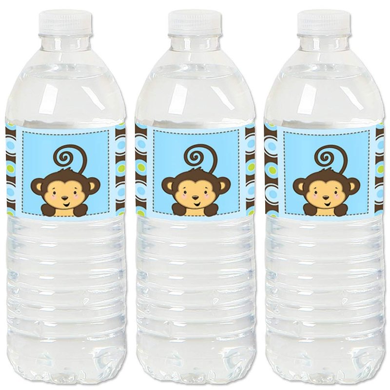 - UNIQUE BEVERAGE BAR: Blue Monkey Boy Water Bottle Labels will make coordinated beverage area at your baby shower or birthday party. Add Blue Monkey Boy Water Bottle Labels to standard water bottles, mini water bottles, soda bottles and single-serving juice containers. Water bottle labels can also be used on cylinder containers to create boy monkey centerpieces.