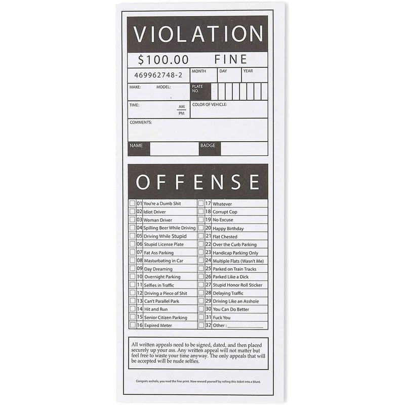 - OFFENSE LIST: These fine tickets are made of durable paper, they're designed to easily tear off and come printed on both sides. Tick from the 31 offenses listed or use the 'other' field to write your own offense