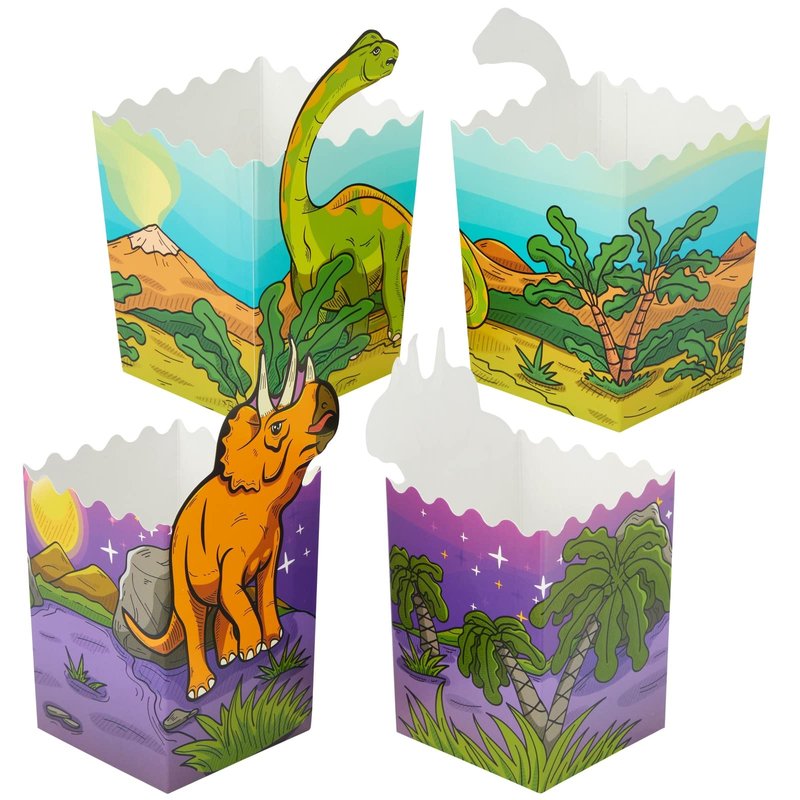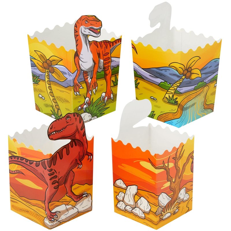 - 4 Jurassic Designs: Our popcorn boxes for kids have die-cut designs that include prehistoric dinosaurs like the T-rex, Brachiosaurus, Velociraptor, and Triceratops