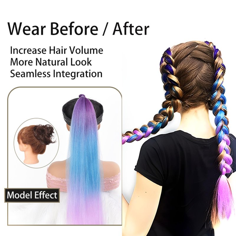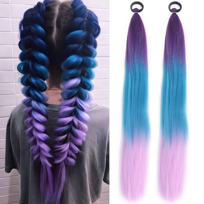 Blue Pink Braided Hair Ponytail Extensions Festival Rave Colorful Hair Extensions for Braids Top Elastic Wrap and Natural Soft Braiding Hair Extension Ombre Synthetic Braid Hair Extensions for Women