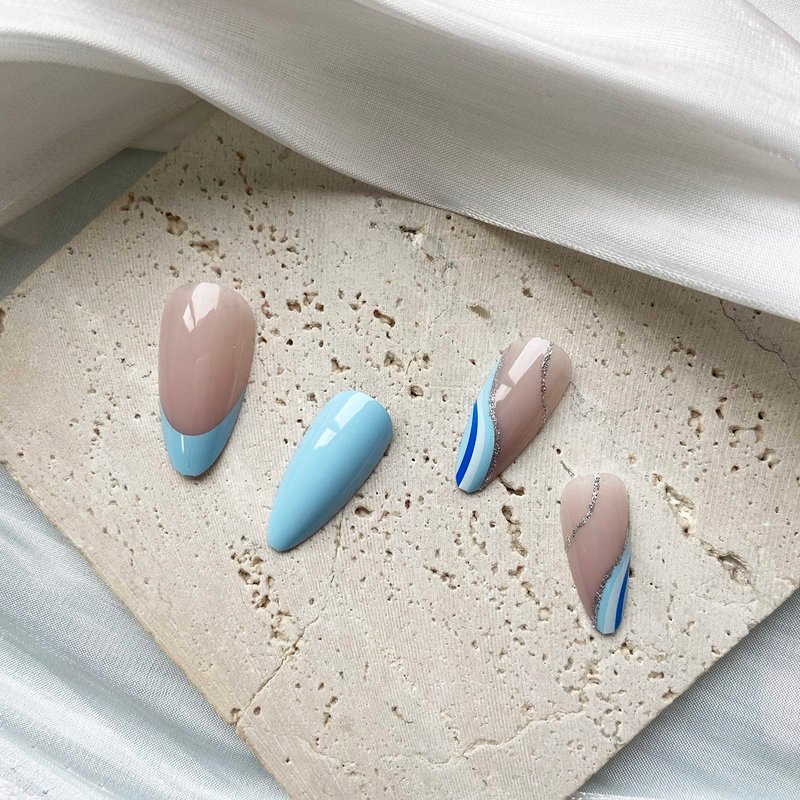 Medium Press on Nails with Design Almond Fake Nails French Stick on Nails Blue Nails for Women Manicure
