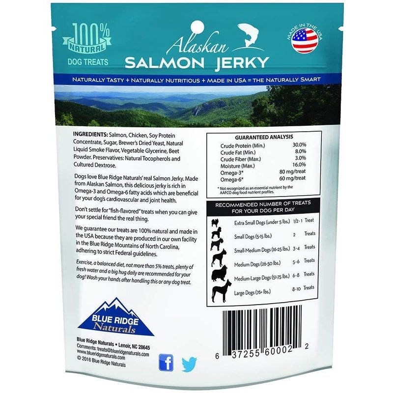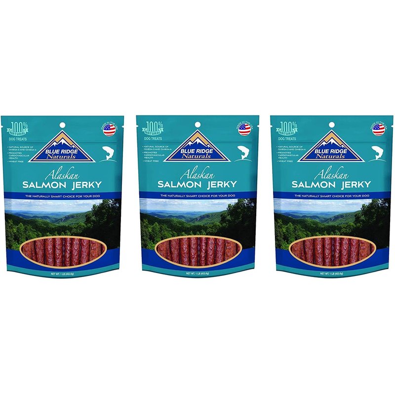 Contains three (3) Blue Ridge Naturals Alaskan Salmon Jerky Dog Treats, 1lb each. Blue Ridge Naturals Salmon Jerky is made from real Alaskan salmon. Rich in Omega-3 and Omega-6 fatty acids, salmon is beneficial for your dog's cardiovascular and joint health. These tasty treats also promote skin and coat condition. They are wheat free and are sure to become your pets favorite snack! Don't settle for "meat-flavored" treats when you can give your friend the real thing