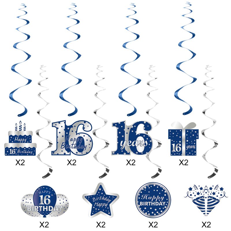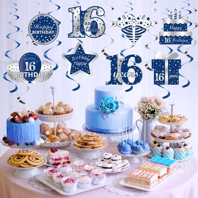 - [You will get] - 16pcs blue and silver 16th Birthday Party Hanging Swirls Decorations. Classic party elements, unique color scheme, a variety of 16 year old patterns, perfect for 16 year old birthday themed party decoration.