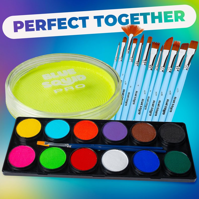 - β ππ’π©ππ ππ¬ π£π₯π’πππ¦π¦ππ’π‘πππ¦ β With its unmatched pigment strength, zero cracking or fading, & one-stroke application, Blue Squid PRO is the top choice for professional facepaint artists worldwide, now with UV-activated neon colors that glow in the dark under blacklight.