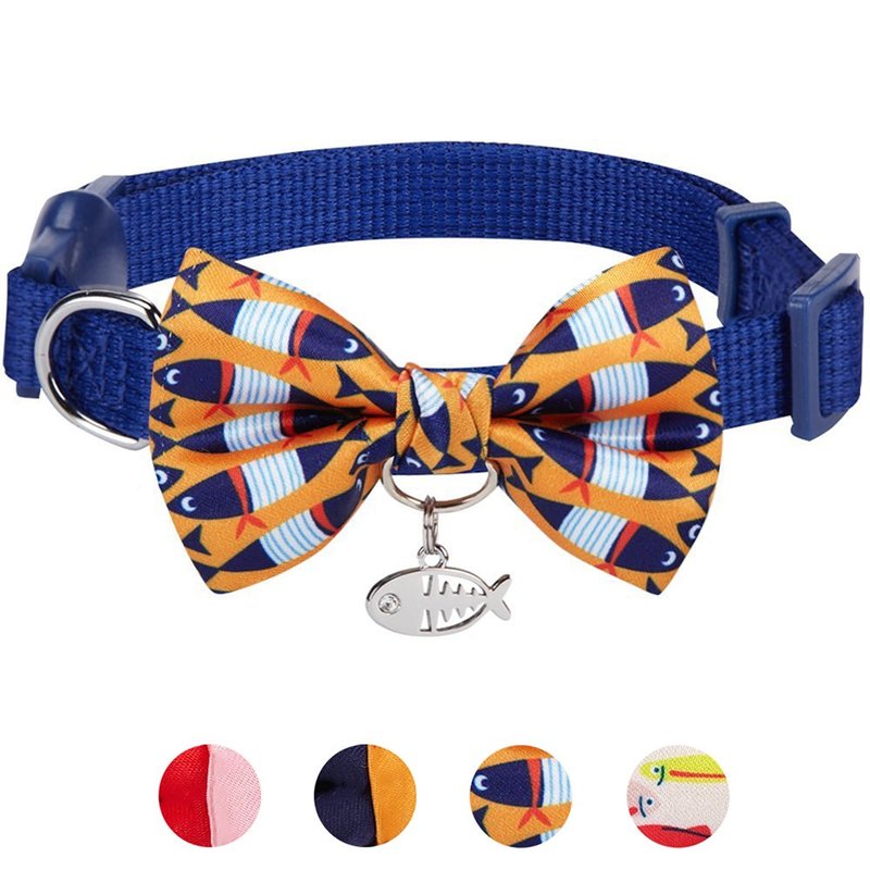 Blueberry Pet Timeless Navy Blue Breakaway Adjustable Chic Fish Print Handmade Bow Tie Cat Collar with European Crystal Bead on Fish Charm, Neck 9"-13", Bow 3" * 2"