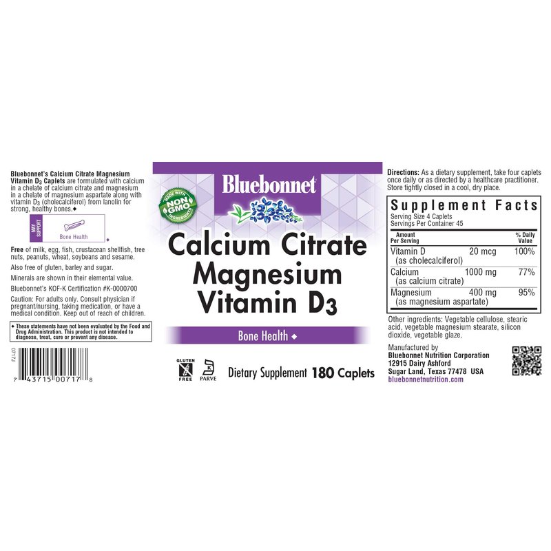 Bluebonnet Nutrition Calcium Citrate Magnesium Plus Vitamin D3 Caplets, Bone Health & Muscle Relaxation, Non GMO, Gluten, Soy & Milk Free, Kosher, White, Unflavored, 180 Count