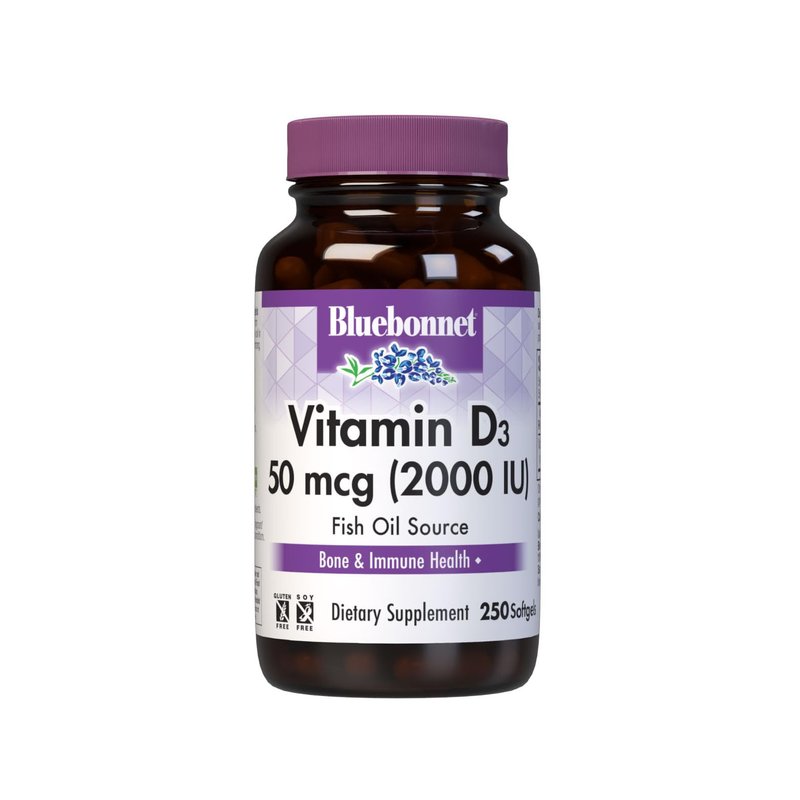 Bluebonnet Nutrition Vitamin D3 2000 IU50 mcg High Potency Immune Support, High Absorption Cold-Water Fish Liver Oil & Plant-Based Non-GMO Safflower Oil, Support Strong Bone, Gluten-Free, 250 Softgels