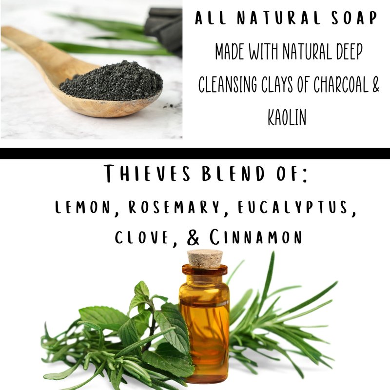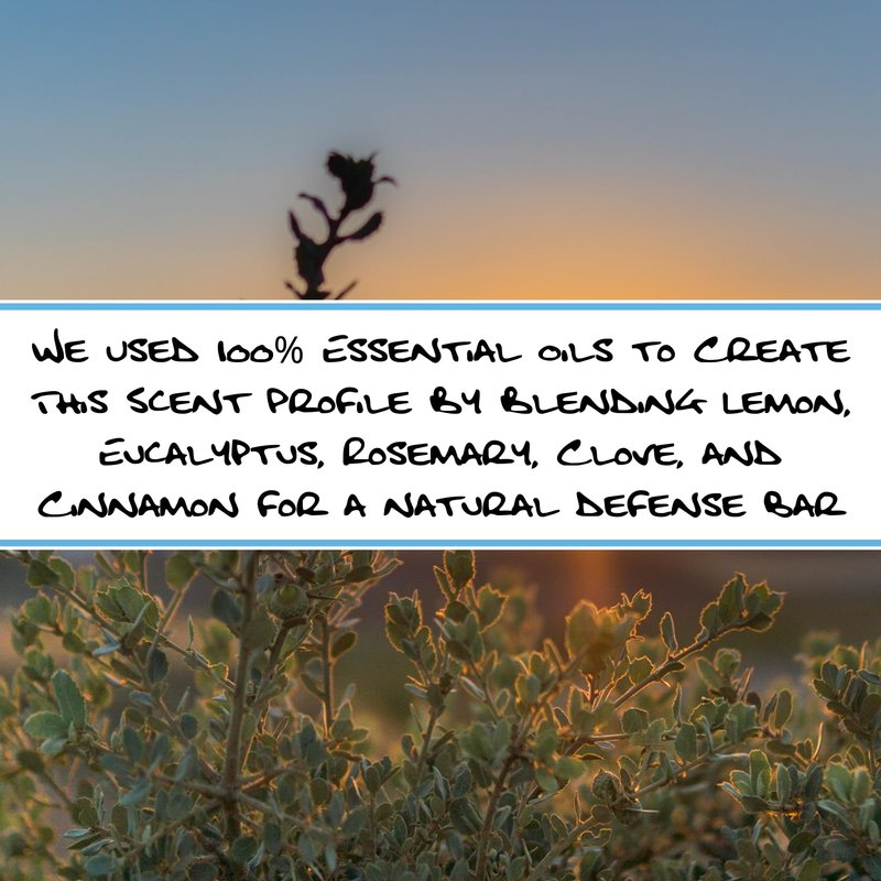 - DEFENDER THIEVES ESSENTIAL OIL BLEND NATURAL DEFENSE SOAP BAR: A Crisp and Clean Blend of Citrusy Essential Oils with Strong Spicy Notes Create This Natural Defense Soap Bar. We Used 100% Essential Oils to Create This Scent Profile By Blending Lemon, Eucalyptus, Rosemary, Clove and Cinnamon for Our Take On The Popular Four Thieves Essential Oil Blend. To Top It Off Skin-Loving Kaolin Clay, Rhassoul Clay, and Activated Charcoal Was Added For Deep Skin Cleansing Benefits.