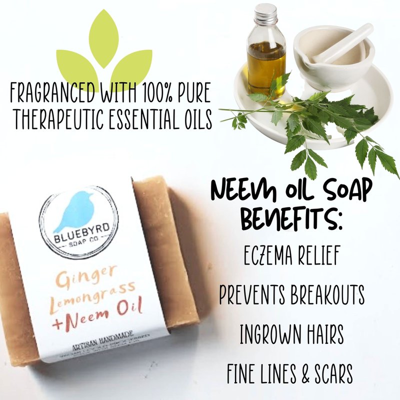 - GINGER LEMONGRASS SOAP BAR WITH NEEM OIL: Neem Oil and Neem extract loaded soap for maximum benefit with Lemongrass, Ginger, and Geranium oils for a great natural scent. Neem oil is said to be beneficial for eczema prone skin, psoriasis and acne. Moisturizing soap bar with olive oil, coconut oil, and shea butter.