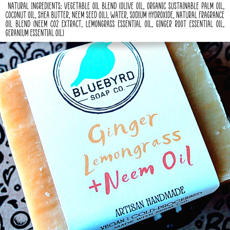 Ingredients: Vegetable Oil Blend (Olive Oil, Organic Sustainable Palm Oil, Coconut Oil, Shea Butter, Neem Seed Oil), Water, Sodium Hydroxide, Natural Fragrance Oil Blend (Neem CO2 Extract, Lemongrass Essential Oil, Ginger Root Essential Oil, Geranium Essential Oil). Bluebyrd Soap Co. is focused on providing the best luxurious natural body care sets and high quality minimal ingredient soap products to its customers. HANDMADE IN THE USA Hand-crafted in small batches using the cold process method to ensure the highest quality possible. Feel and see the difference in your skin when you use natural ingredients in your skin care. A healthy-looking complexion is the reward for properly nourished skin. All of our collections are perfect to use for yourself throughout your household either in your bath, kitchen, for travel, the gym, guest soaps , or at your office. Give to Coworkers, Women, Men, as a Unisex gift, Teachers gifts, Appreciation gifts, Teenagers, College Students, Valentines, Christmas and to mark off all your holiday and birthday present needs.Safety Information: Avoid contact with eyes. Discontinue use if irritation occurs. None of these health benefits should be used in place of personal judgement or medical treatment when needed, nor are they intended to diagnose, treat, cure or prevent any disease.