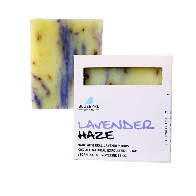 - LAVENDER HAZE SCENTED BAR SOAP: Our Lavender Haze Soap Bar delivers the aroma of relaxing lavender with a hint of soft musk to create the feel of walking through soft lavender flower fields. A beautifully crafted bar with swirls of deep purples and real lavender buds for gentle skin exfoliation.