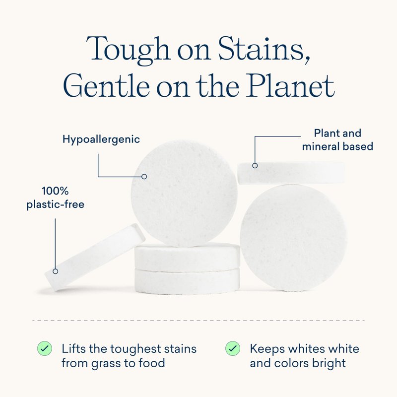 The first and only plastic-free laundry tablet on the market in a convenient single-use format that isn’t wrapped in a plastic film. Our dry-form tablet lifts stains and dirt like the miracle worker it is – so you can get a powerful wash without any of the waste. CLEAN INGREDIENTS. Small but mighty concentrated tablet is hypoallergenic, fragrance free, dye free, and optical brightener free. EPA Safer Choice, Leaping Bunny Cruelty-Free, Vegan, B Corp Certified, Climate Neutral Certified.