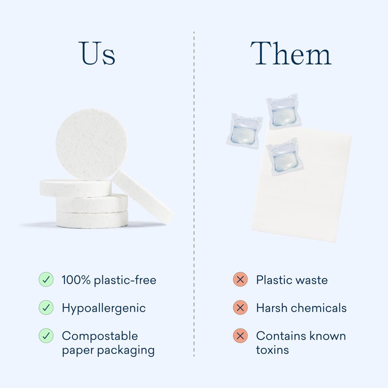 - PLASTIC-FREE, ECO-FRIENDLY LAUNDRY TABLETS. The first and only plastic-free Laundry Detergent Tablets that are tough on stains, but gentle on the planet. Our 100% plastic-free tablet is just as easy as any detergent pod, without any of the plastic film (PVA) found in most conventional pods.
