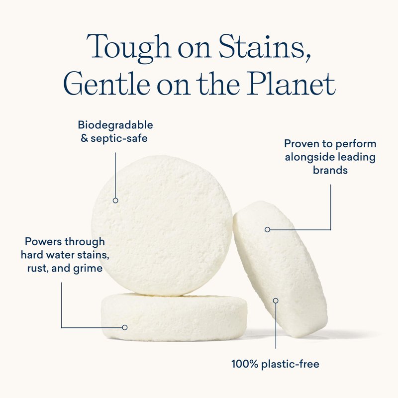 - CLEAN INGREDIENTS. Plant and mineral-based tablet is 100% bio-based, biodegradable and septic-safe. Made without chlorine bleach, hydrochloric acid, no CTAC, no dyes, plastic-free. EPA Safer Choice, Leaping Bunny Cruelty-Free, Vegan, B Corp Certified, Climate Neutral, USDA Bio-Preferred.