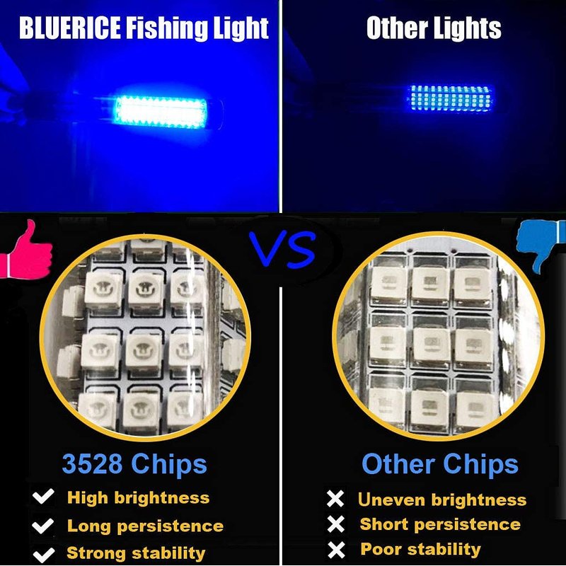 - 【DURABLE AND STABLE】BLUERICE Night Fishing Light could self drop fast no need any other added weighs. The other end of the fish lamp is covered with iron to make it sink quickly. The iron is wrapped in a tube to prevent rusting, which expands and shrinks when heated.