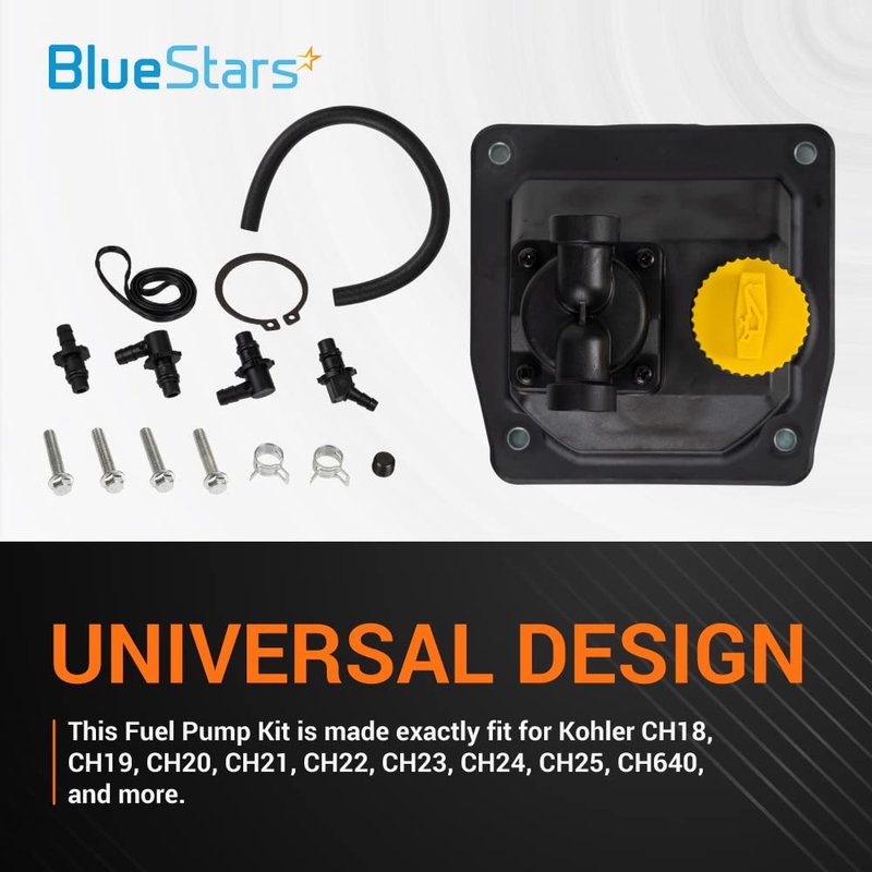 BlueStars 24 559 02-S Fuel Pump Kit is made exactly fit for Kohler CH18, CH19, CH20, CH21, CH22, CH23, CH24, CH25, CH640, CH670, CH680, CH682, CH730, CH740, CH742, CH752, CH750, ECH630, ECH650, ECH680, ECH749, ECH730, ECH740, and more. It replaces parts number #2455910-S, K2455910S, 2439313-S, 2439312-S, 2455908-S, 2439314-S, 2455902-S, and more.